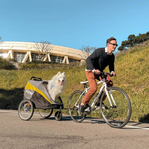 Der Hundekinderwagen lässt sich spielend leicht in einen Fahrradanhänger verwandeln. So können Sie Ihren Hund bequem transportieren und ihn gleichzeitig an Ihren sportlichen Aktivitäten teilhaben lassen. Perfekt für lange Ausflüge oder den Weg zum Tierarzt.